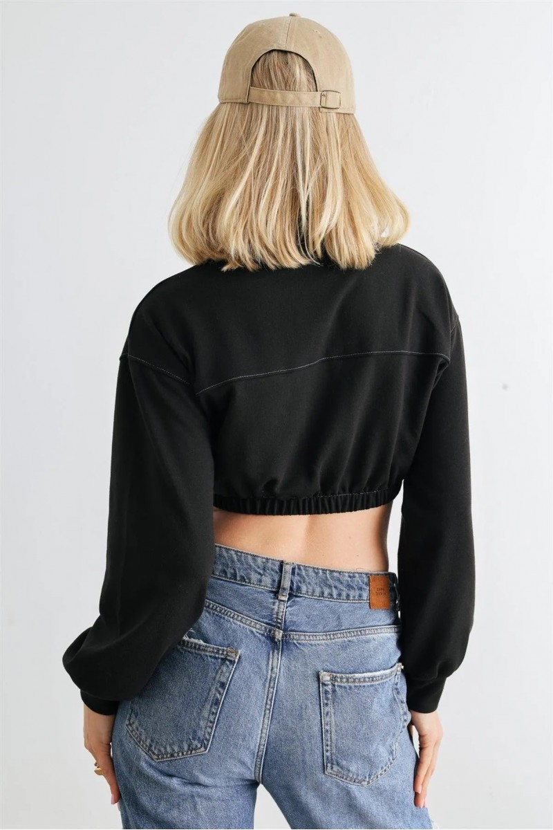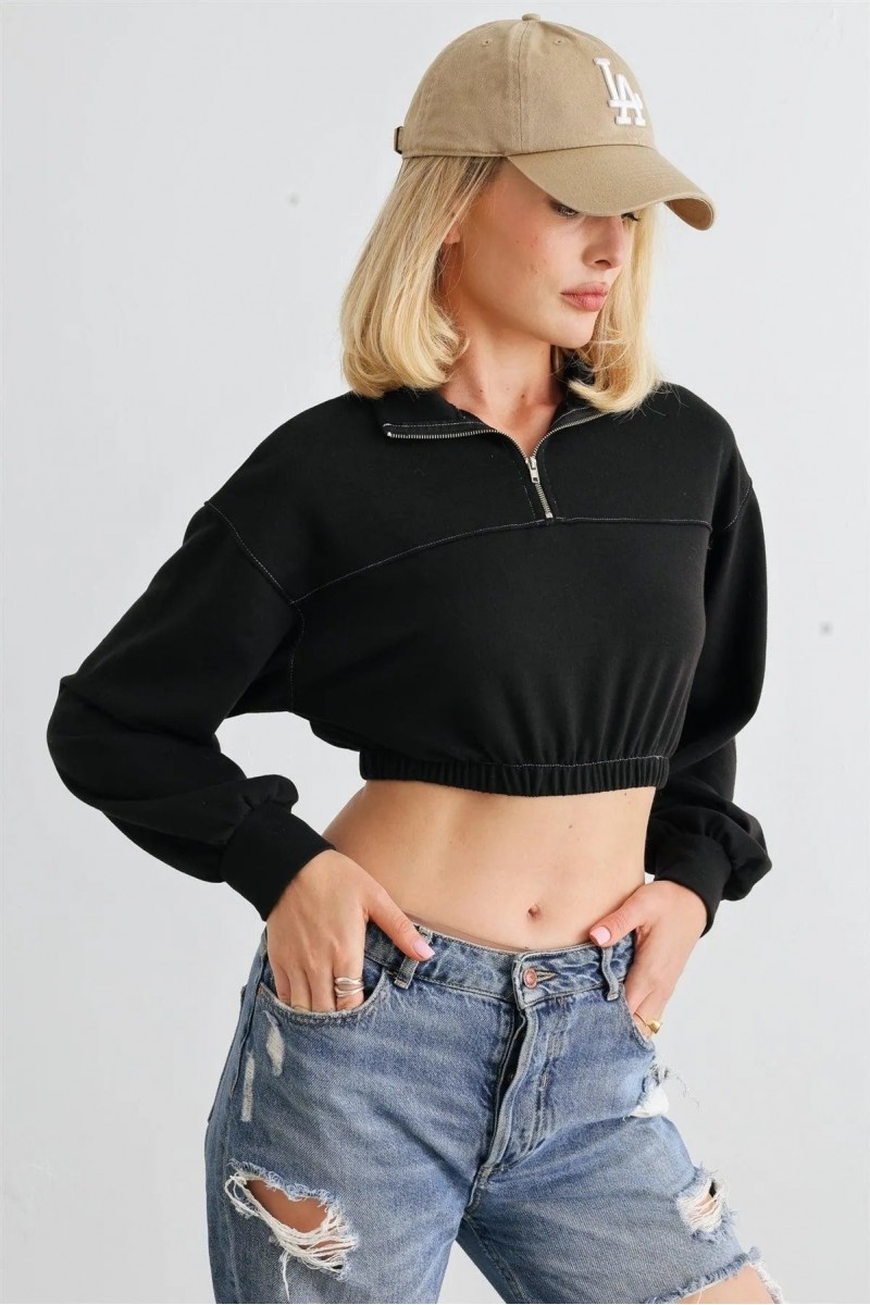 Item Features: Black, cuffed long sleeves, zip-up mock neckline, elasticized hem, cropped length, semi-stretchy, not see through, unlined, casual, cute, comfy.