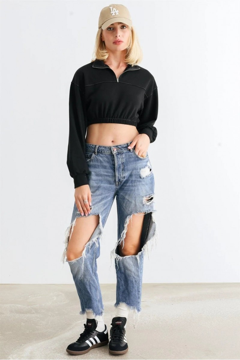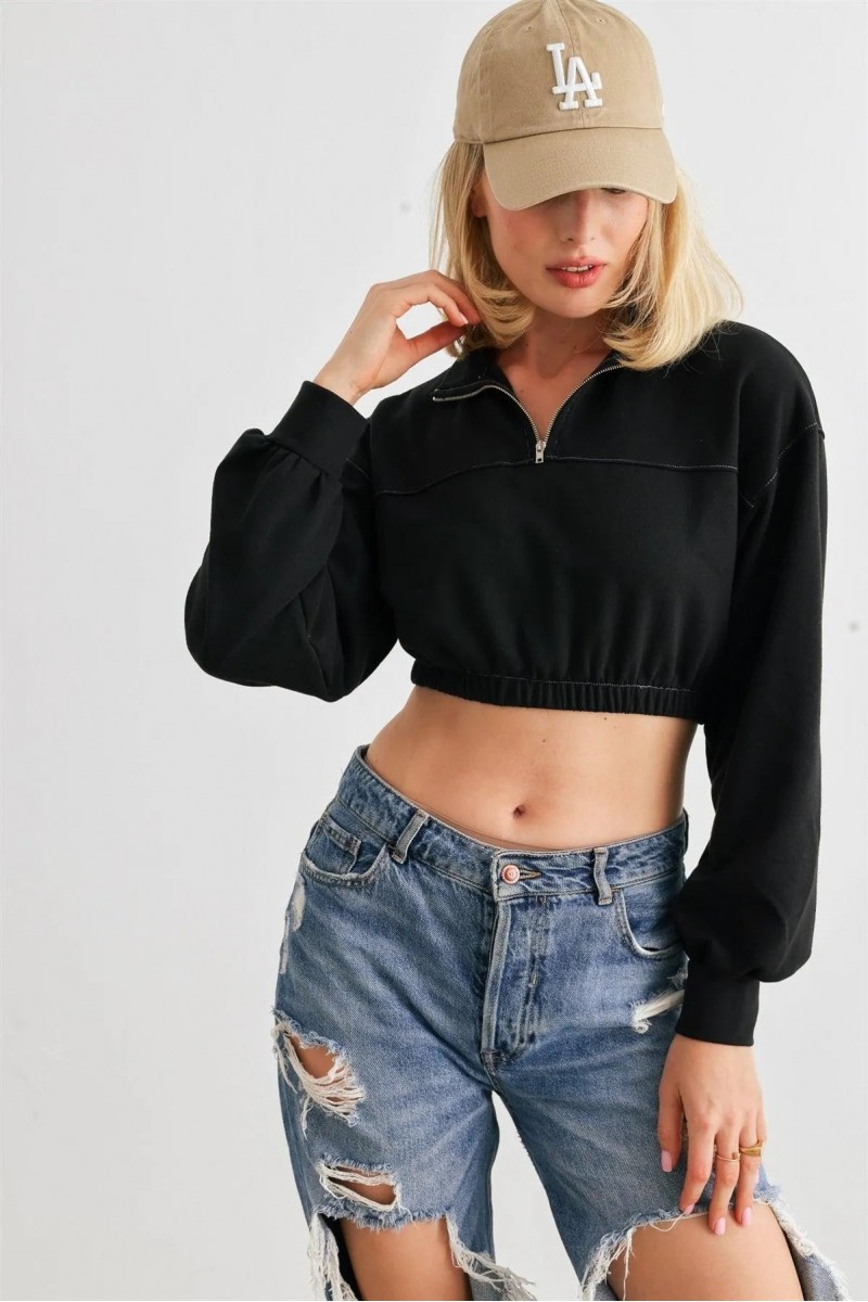 Black Zip-Up Mock Neck Long Sleeve Elastic Hem Crop Top /1-2-2-1