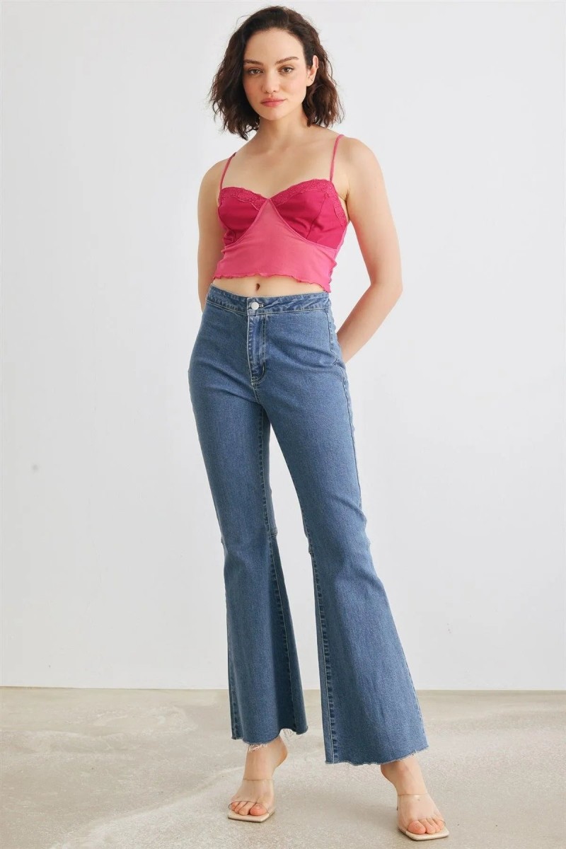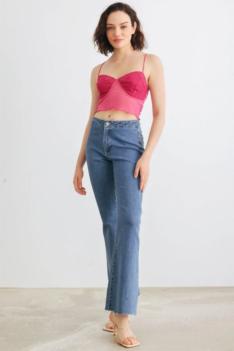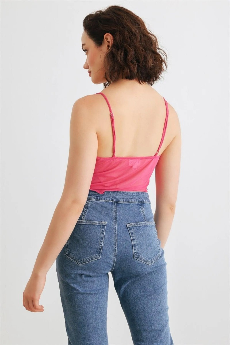 Item Features: Magenta fuchsia, mesh material, lace, sleeveless, adjustable straps, lettuce hem, cropped length, semi-stretchy, see through, lined, sexy, cool, hot, girlish.