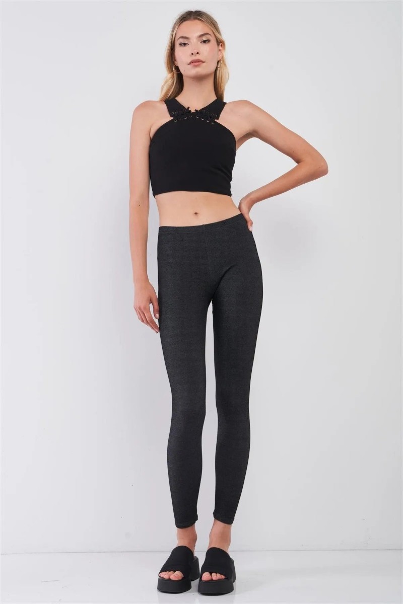 These washed black leggings offer a mid-rise fit with a stretchy waistline, ankle length and sculpting abilities. Perfect for yoga, gym, or outdoor activities, these solid leggings provide a sporty and comfy option for your workout attire.
