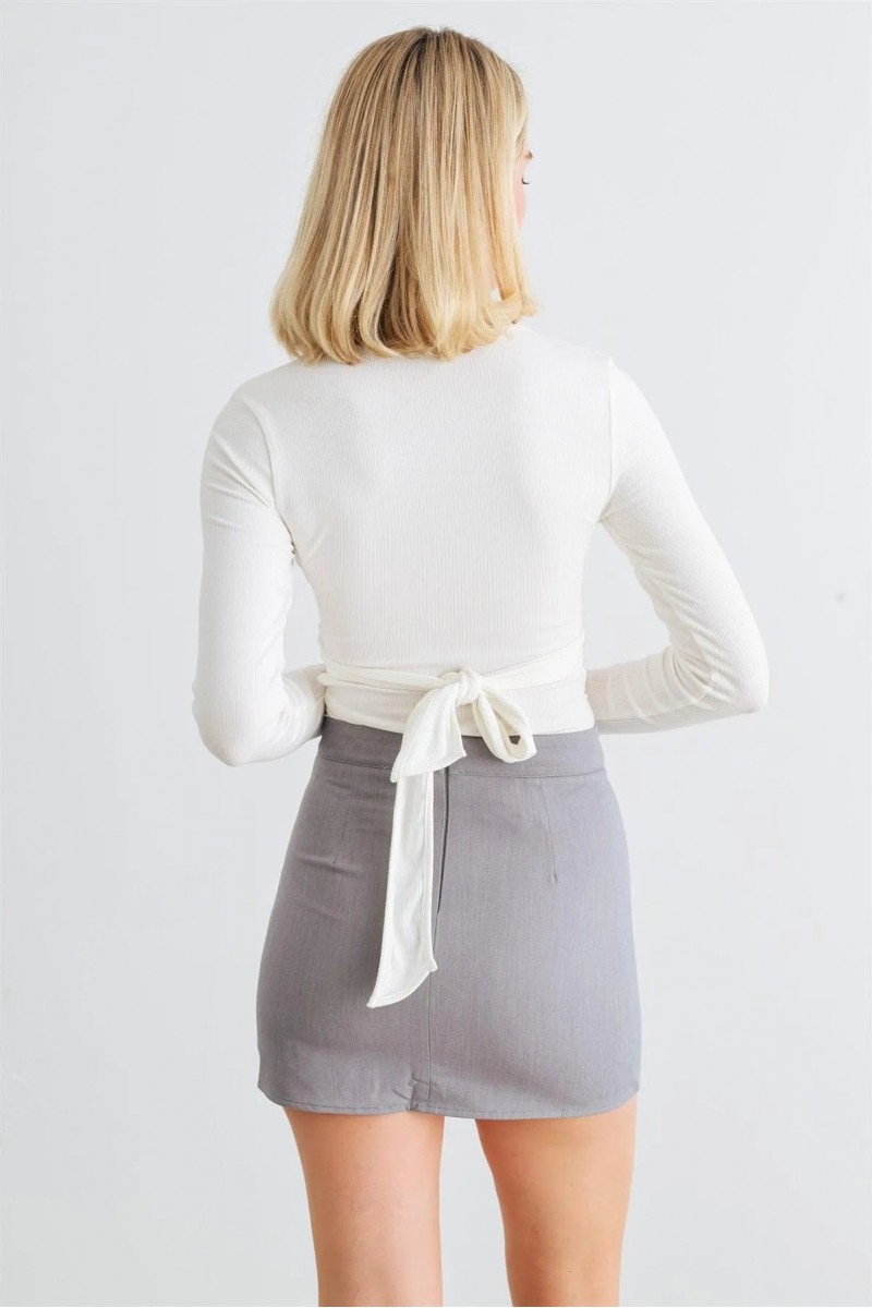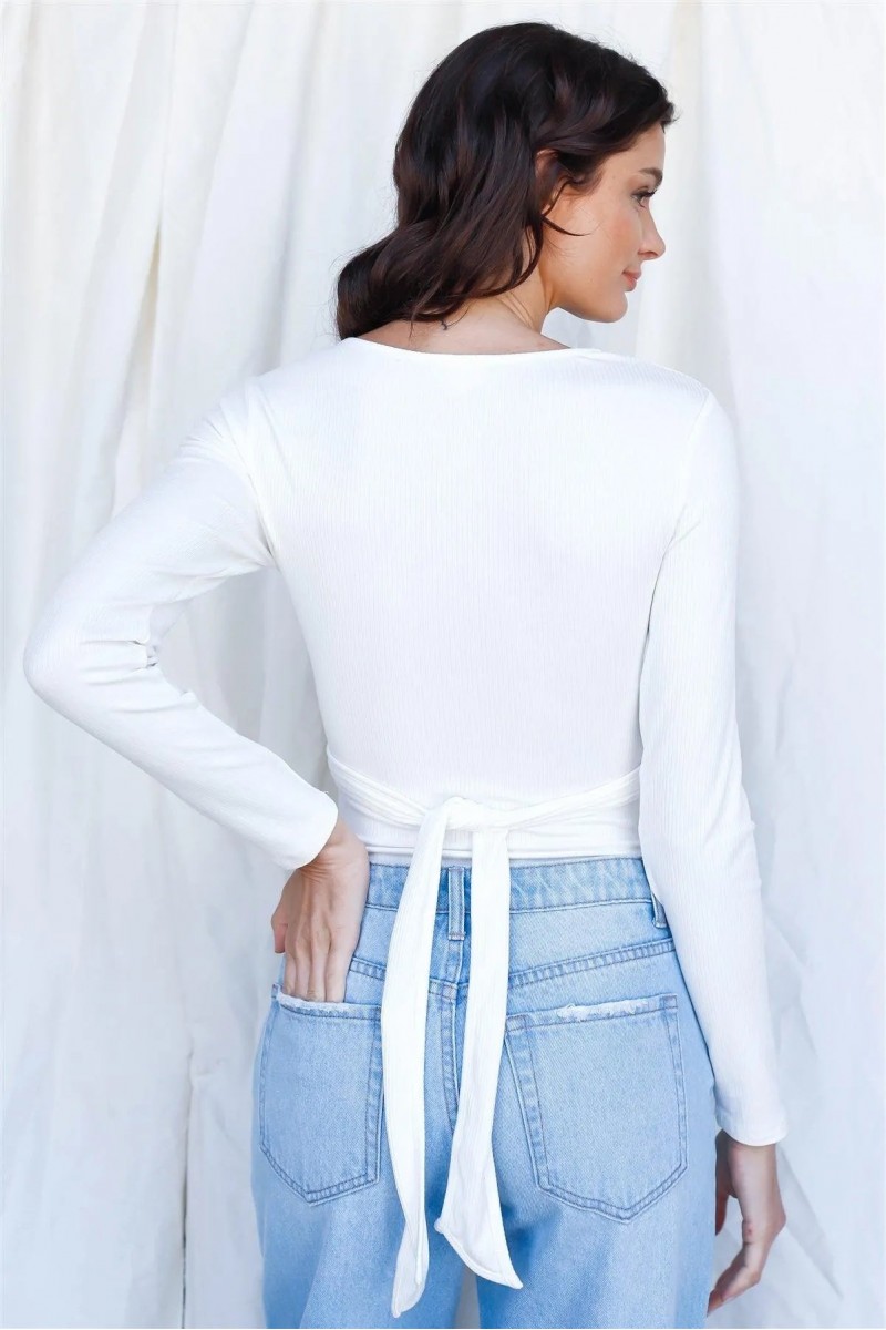 Item Features: White, solid color, ribbed material, o-ring front detail with attached self-tie detail, side cut-outs, long sleeves, v-neckline, thong double snap closure, slim fit, stretchy, not see through, unlined, trendy, stylish, cute, must have