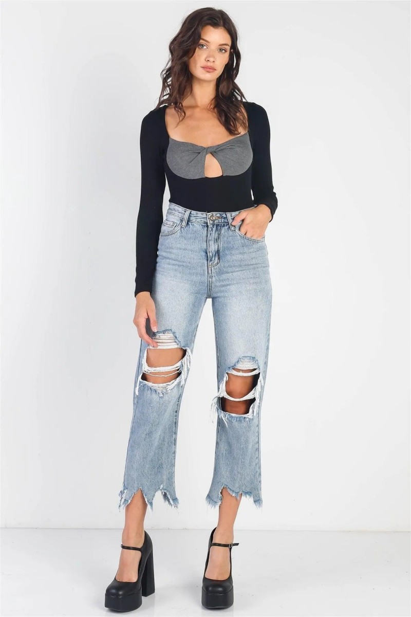 Color & Design: Featuring a chic black and grey color combination, the ribbed material adds texture, while the bustier cut-out twisted detail brings a trendy, stylish touch.