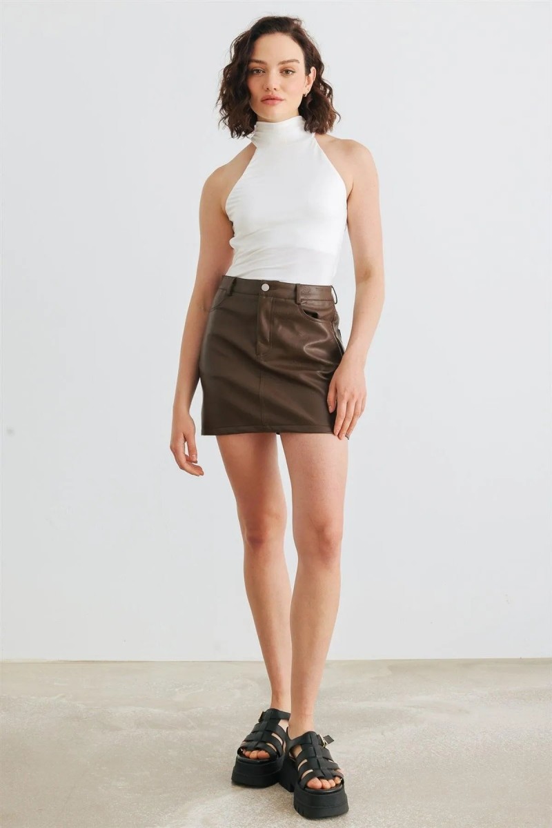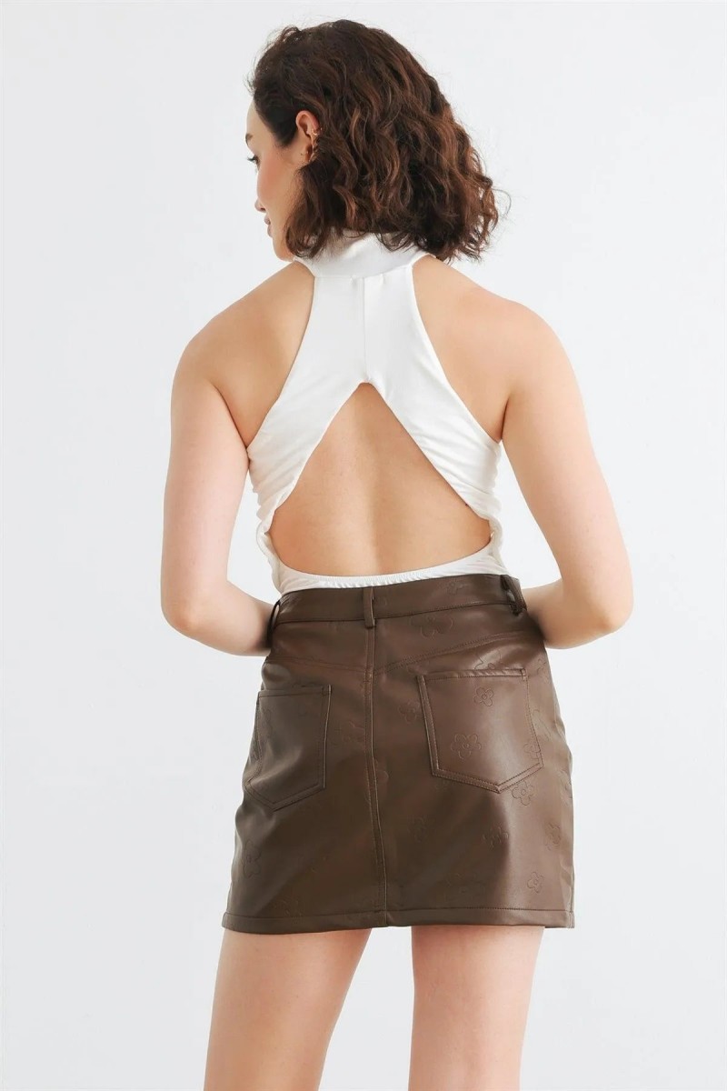 Item Features: Off-white, sleeveless, mock neckline, soft to touch, thong double snap closure, open back, semi-stretchy, not see through, unlined, casual, cute, cool, stylish