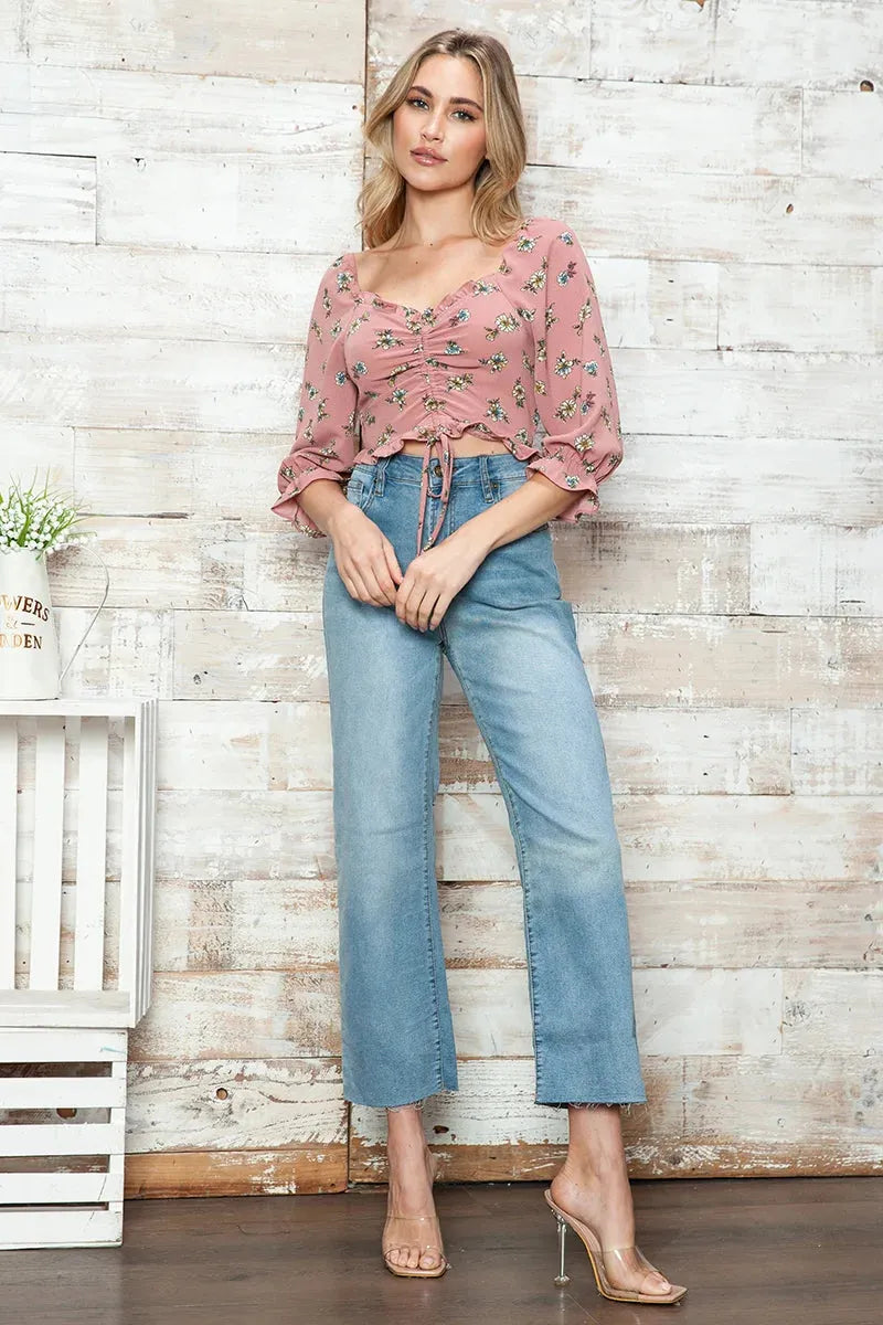 Features: Lightweight breathable fabric, ruched front design, adjustable drawstring ties, ruffle hem trim, 3/4 balloon sleeves with elastic cuffs, dainty floral print, square neckline, cropped length, true to size